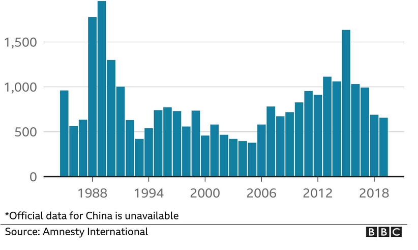 Zvanični podaci iz Kine nisu dostupni, gdje je statistika smrtnih kazni državna tajna, ali organizacija za ljudska prava "Amnesty International" procjenjuje da je izvela hiljade pogubljenja u 2019.