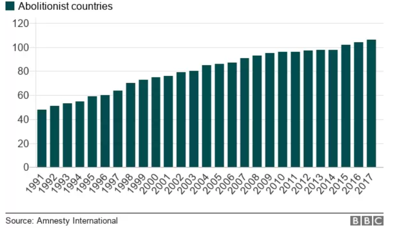 Broj zemalja koje su formalno ukinule smrtnu kaznu stalno se povećavao, sa 48 u 1991. na 106 u 2017. godini. Nijedna druga država nije zabranila smrtnu kaznu 2019. drugu godinu zaredom, ali Amnesty kaže da su 142 zemlje ukinule smrtnu kaznu u zakonu ili u praksi.