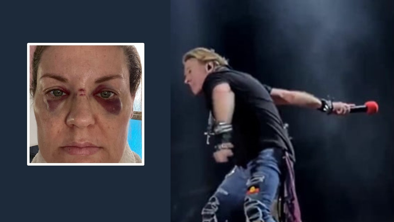 Photo; Inset image, screenshot Rebecca Howe The Advertiser facebook www.facebook.com/theadvertiser (and below) and screenhot:BLabbermouth Woman Claims She Was Left 'Bloodied' After Being Hit By AXL ROSE's Microphone During GUNS N' ROSES Concert