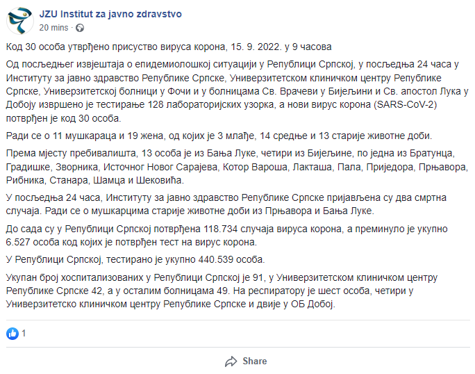 U posljednja 24 časa, Institutu za javno zdravstvo Republike Srpske prijavljena su dva smrtna slučaja. Radi se o muškarcima starije životne dobi iz Prnjavora i Banja Luke.