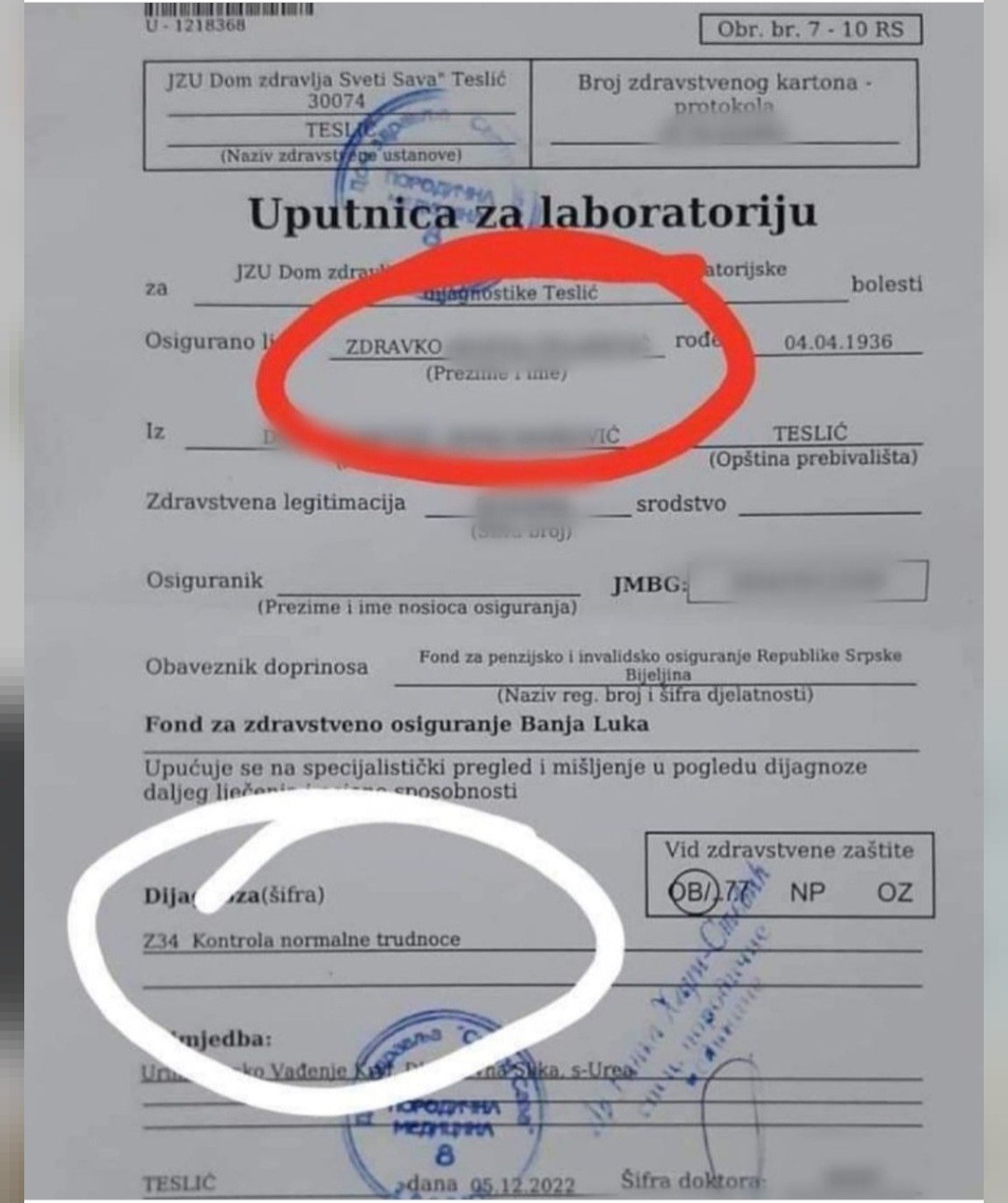 Po svim društvenim mrežama kruži uputnica teslićkog Doma zdravlja na ime pomenutog starca na kojoj, u rubrici za dijagnoze, piše „Kontrola normalne trudnoće“.