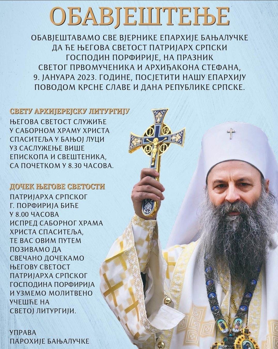 "Pozivamo vas da svečano dočekamo njegovu svetost patrijarha srpskog Gospodina Porfirija i uzmemo molitveno učešće na svetoj Liturgiji", saopšteno je iz banjalučke parohije.