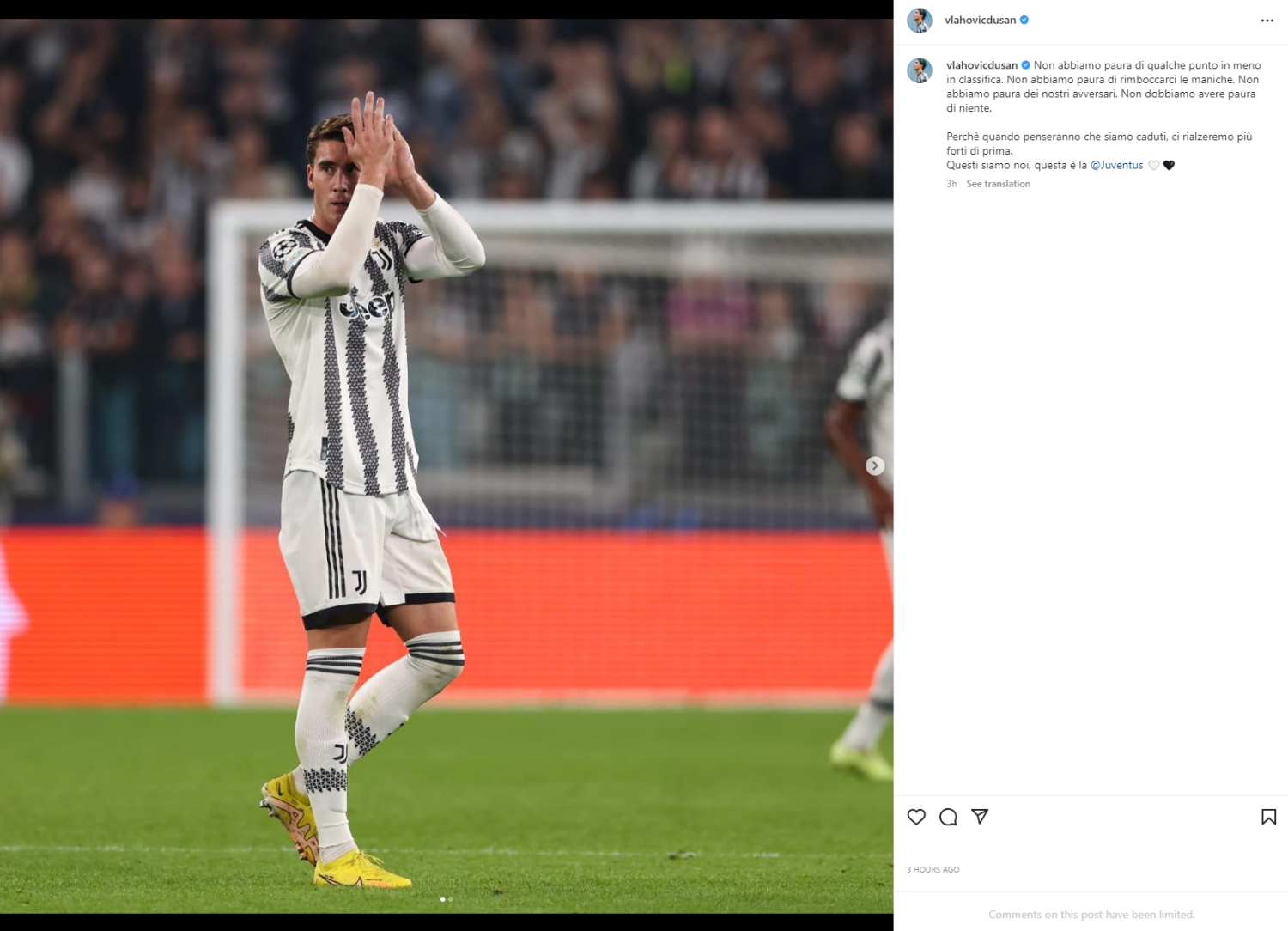 “Ne bojimo se nekoliko bodova manje na ljestvici. Ne bojimo se zasukati rukave. Ne bojimo se protivnika. Ne trebamo se ničega bojati. Jer kad pomisle da smo pali, ustaćemo jači nego prije. ovo smo mi, ovo je Juventus”, napisao je srpski napadač na Instagramu.