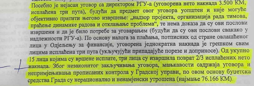 „Nije utvrđen obim posla i rok završetka zbog čega je naknada paušalno utvrđena u visini njihove plate i u rasponu od 800 do 3.500 KM. Nisu utvrđena lica koja vrše nadzor nad izvršenjem, nisu priloženi izvještaji/dokazi da su poslovi izvršeni u ugovorenom obimu i kvalitetu, niti su uspostavljene kontrole u likvidaturi i obračunu prije isplate“, navodi se u izvještaju.