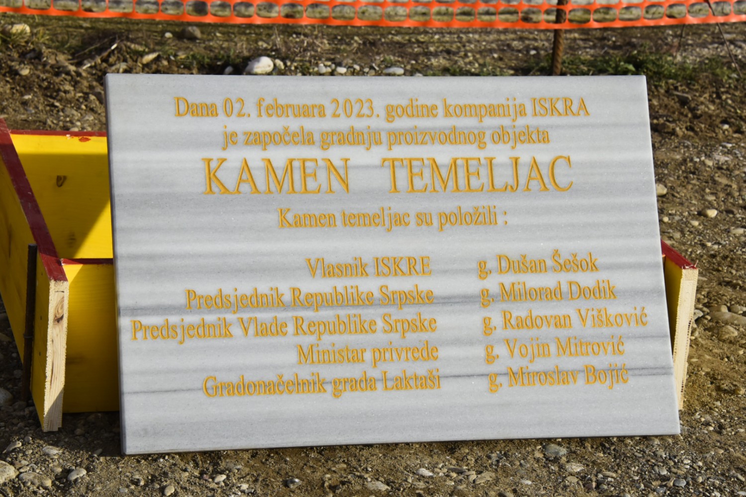 Kamen temeljac su položili predsjednik Republike Srpse Milorad Dodik, premijer Radovan Višković, ministar privrede Vojin Mitrović, gradonačelnik Laktaša Miroslav Bojić i vlasnik kompanije "Iskra" Dušan Šešok, javlja Srna.