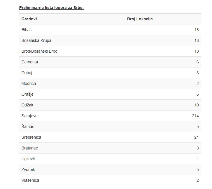Lista mjesta na kojima su bili logori nije potpuna, kazali su iz Republičkog centra za istraživanje rata, ratnih zločina i traženje nestalih lica, a ono što je do sada preliminarno targetirano na bazi svjedočenja zatvorenika te podataka zvaničnih institucija jesu prijeratne opštine Bihać, Bosanska Krupa, Bratunac, Brod, Vlasenica, Derventa, Doboj, Zvornik, Modriča, Orašje, Odžak, Srebrenica, Ugljevik i Šamac, te pet gradskih i pet prigradskih opština u Sarajevu.