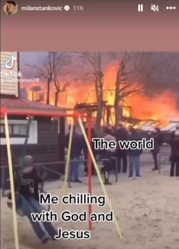 Milan je sada objavio „mim“ na Instagram storiju na kojem se djevojčica ljulja na ljuljašci, dok iza nje gori kuća, a u opisu stoji „svijet trenutno“, a iznad djevojčice „ja koji uživam sa Bogom i Isusom“, što je definitivno znak da se više okrenuo vjeri, nego zbivanjima u zemlji i opterećenošću slavom, novcem i slično, piše Ekskluziva.ba.