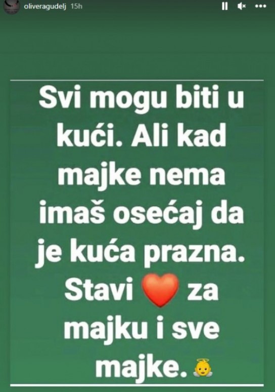 Kako navodi „Hello“, majka Nemanje Gudelja aktivna je na Instagramu, a u njenim objavama stalno se traže skrivene poruke koje bi mogle da potvrde glasine. Da li je među njima i najnovija: „Svi mogu biti u kući. Ali kad majke nema, imaš osećaj da je kuća prazna. Stavi srce za majku i sve majke.“