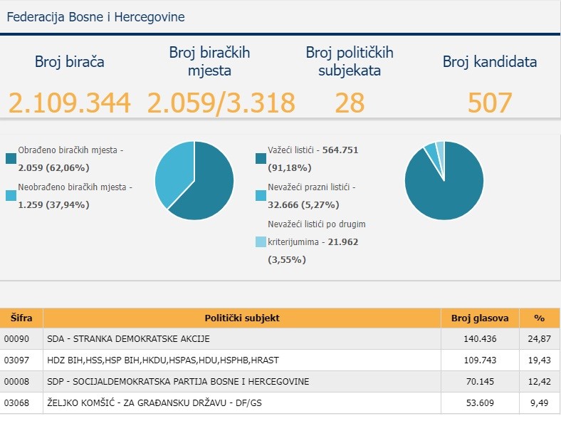 Nakon 62 odsto obrađenih biračkih mjesta iz FBiH, SDA je uvjerljivo prva sa 140.436 glasova ili 24,87 odsto a druga je koalicija okupljena oko HDZ-a BiH sa 109.743 ili 19,43 odsto.
