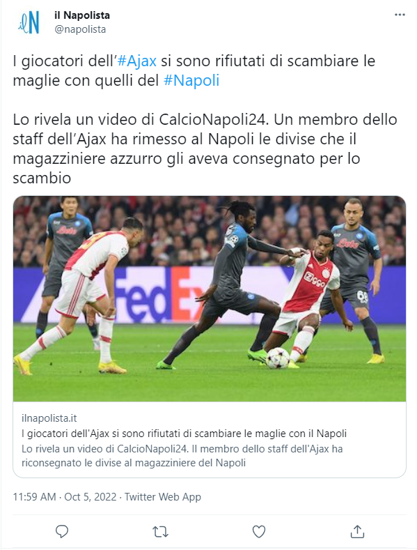 Kako ističe "CalcioNapoli24", član stožera Napolija je nakon utakmice otišao u svlačionicu Ajaksa kako bi razmijenio dresove, što je uobičajna gesta nakon utakmice Lige šampiona, ali je ponuda odbijena.