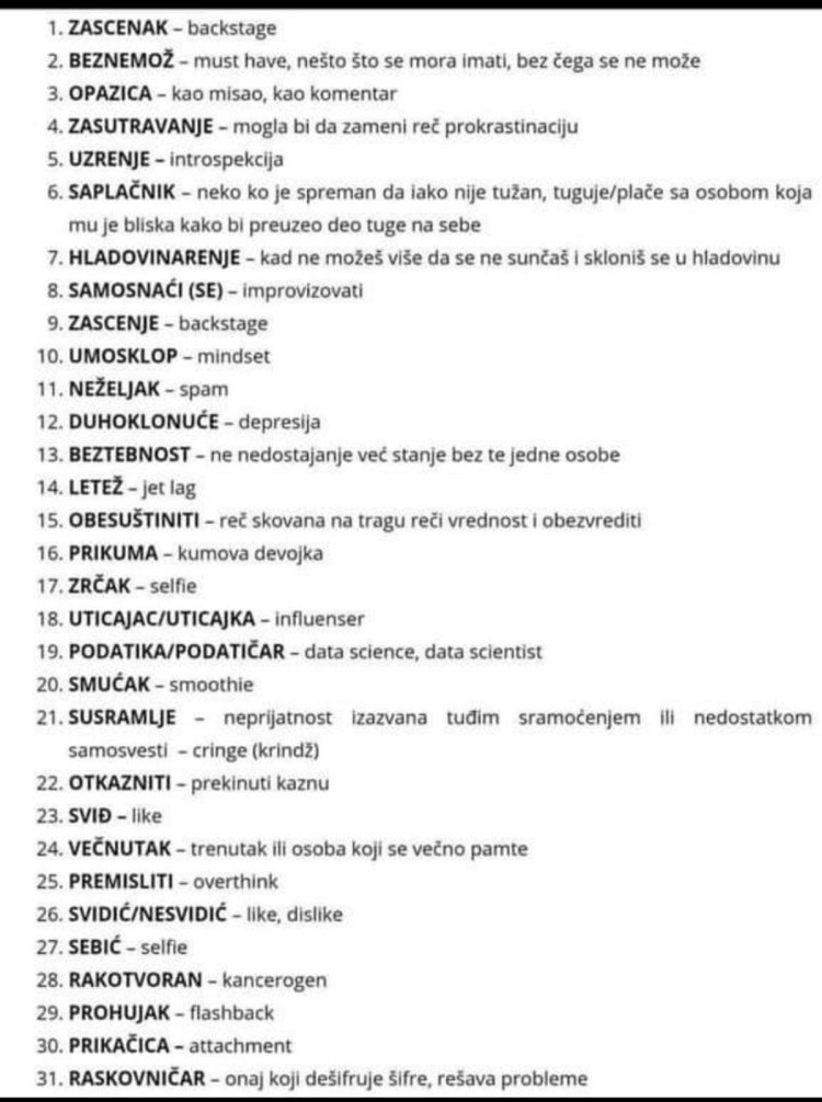 Tako se engleska riječ backstage na srpskom jeziku od sada prevodi kao zascenak, dok će se misao, odnosno komentar, ubuduće prevoditi kao opazica.
