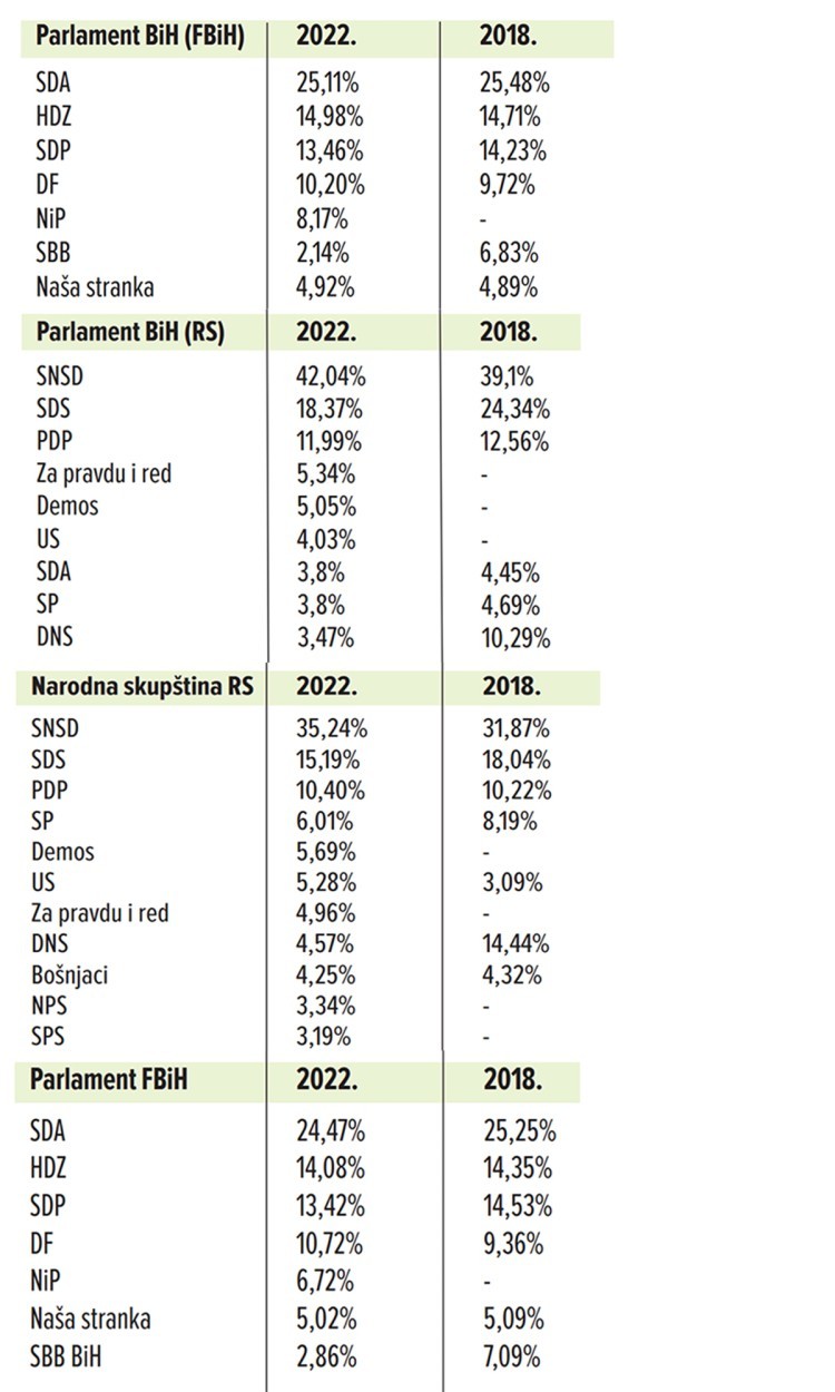 Kada je riječ o izborima za Predstavnički dom Parlamentarne skupštine BiH i strankama sa sjedištem u Federaciji BiH, SDA, HDZ, SDP te DF praktično su ponovili rezultat sa izbora 2018. godine, dok je, kao što smo naveli, SBB doživio drastičan pad.