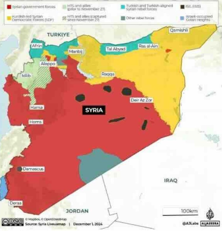 Prema mapi koju je objavio Al Jazeera, kontrolu nad Sirijom trenutno dijele četiri glavne frakcije: