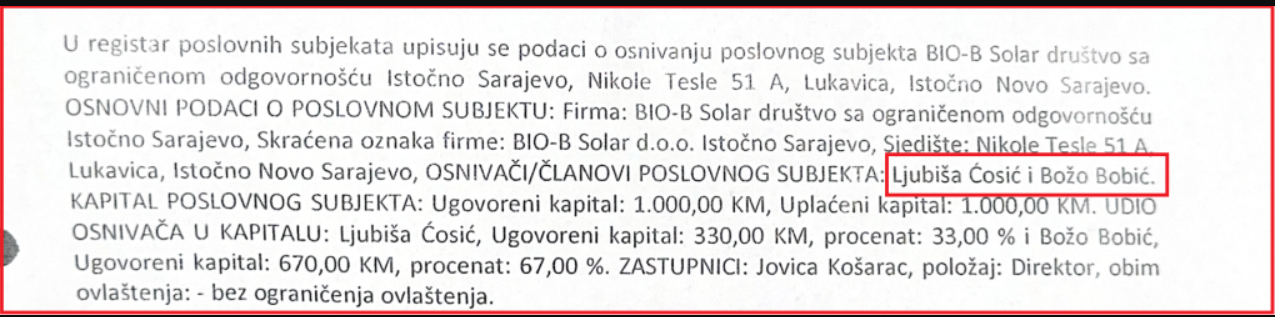 Između podnošenja prijava CIK-u, odnosno dva mandata, gradonačelnik je uspio osnovati i firmu za proizvodnju električne energije “BIO- B Solar” Istočno Novo Sarajevo. Firmu je osnovao 2023. zajedno sa jednim od privrednika bliskih vlastima u Istočnom Sarajevu, odnosno Božom Bobićem.