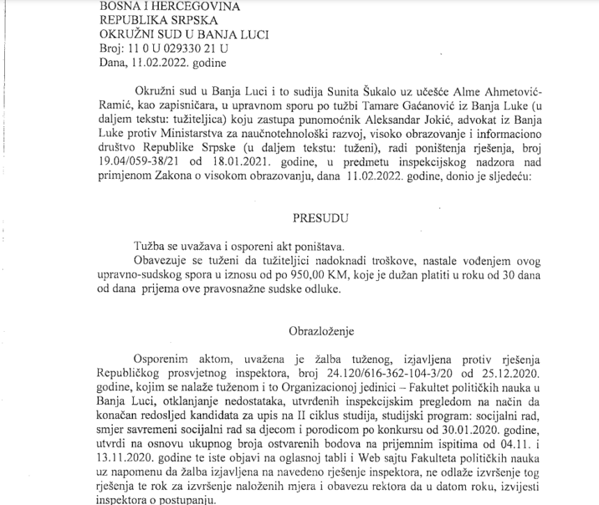 Studentica Tamara Gaćanović je krajem 2020. godine upisala master studije na Fakultetu političkih nauka Univerziteta u Banjoj Luci, a prijemni je imala u terminu kada je bila u izolaciji, te je zbgo nemogućnosti da radi prijemni ispit izgubila mogućnost da se finansira putem budžeta. Zbog svega navedenog, studentica je odlučila da tuži FPN, nakon čega je sud presudio u njenu korist.