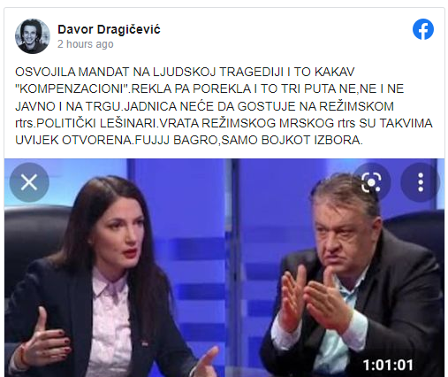 “Osvojila mandat na ljudskoj tragediji i to kakav ‘kompenzacioni’ rekla, pa porekla i to tri puta ne, ne i ne javno i na Trgu. Jadnica neće da gostuje na režimskom RTRS. Politički lešinari. Vrata režimskog mrskog RTRS su takvima uvijek otvorena. Fujjj bagro, samo bojkot izbora”, napisao je Dragičević.