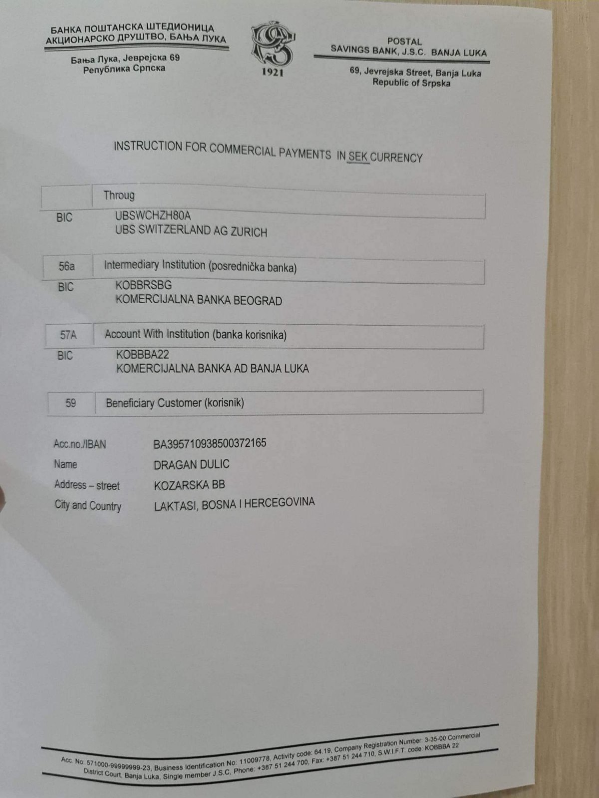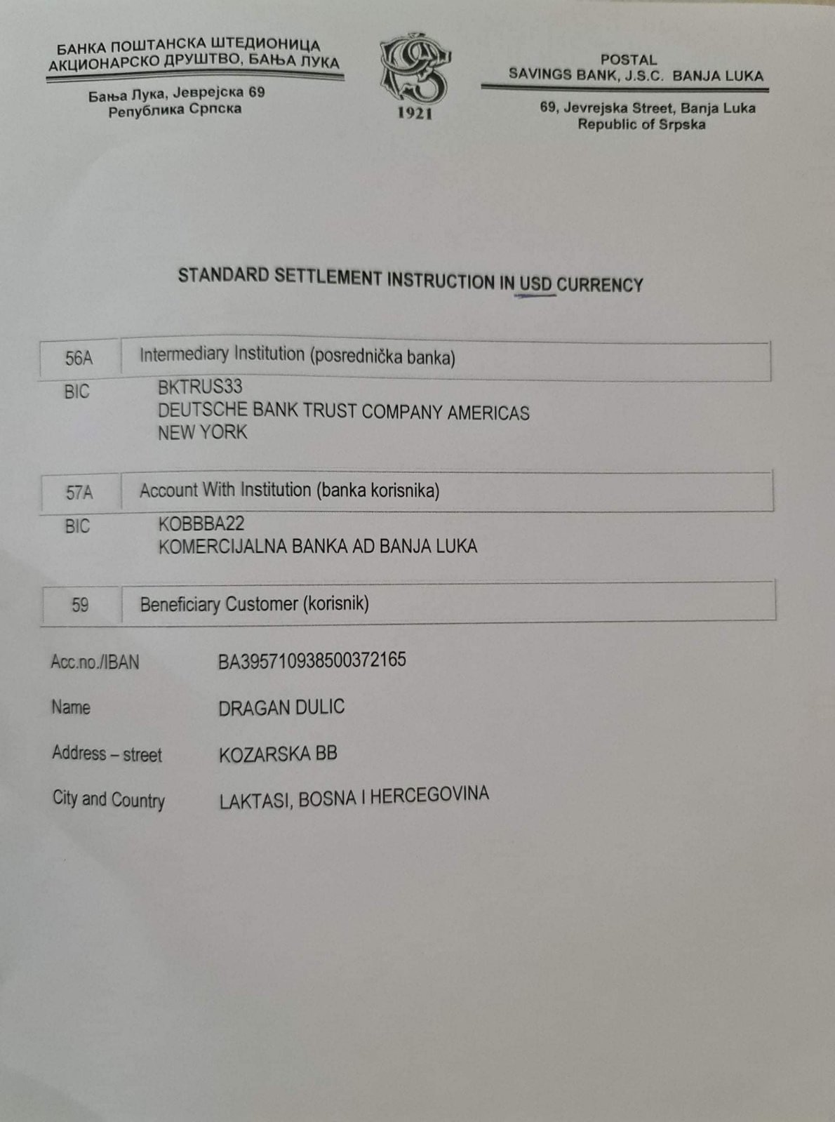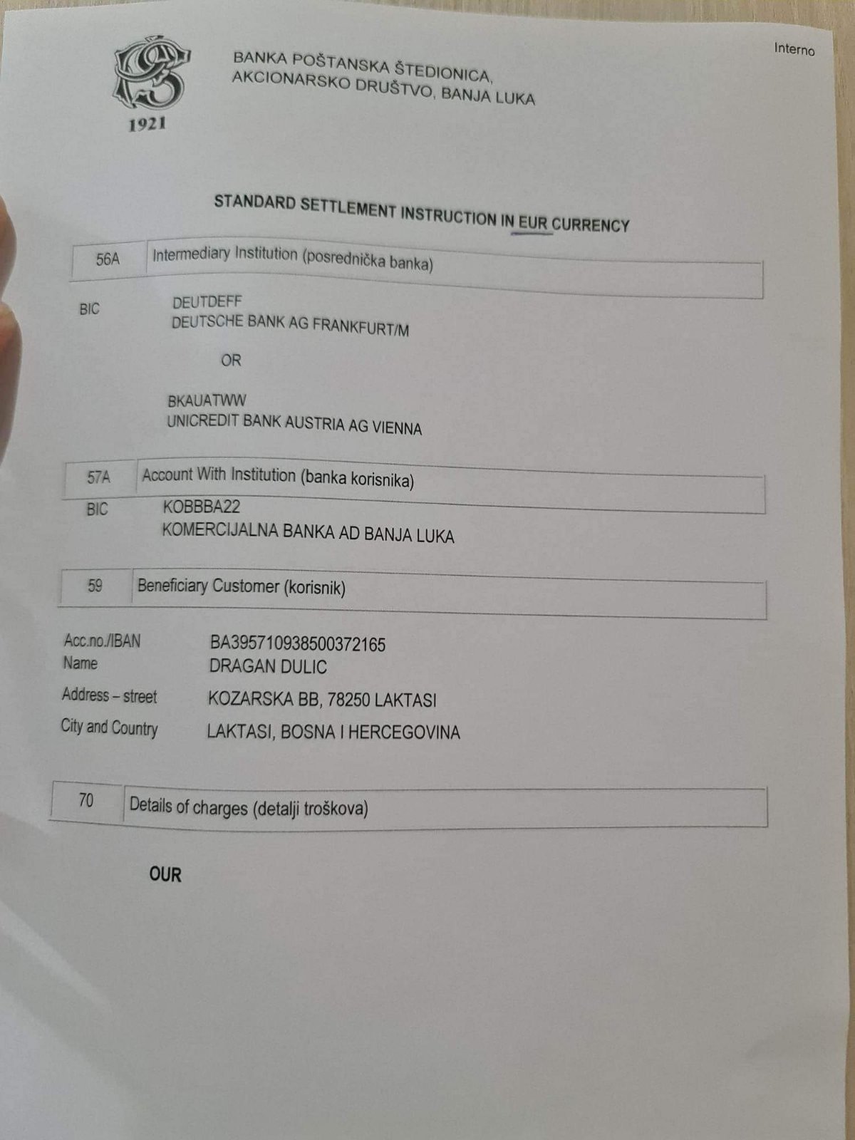 Svi koji žele pomoći, to mogu da urade uplatom na žiro račun 571-090-01009634-44, na ime Dulić Dragan. Oni koji su u inostranstvu to mogu da učine preko deviznog račun 0938500003721, takođe na ime Dragan Dulić.